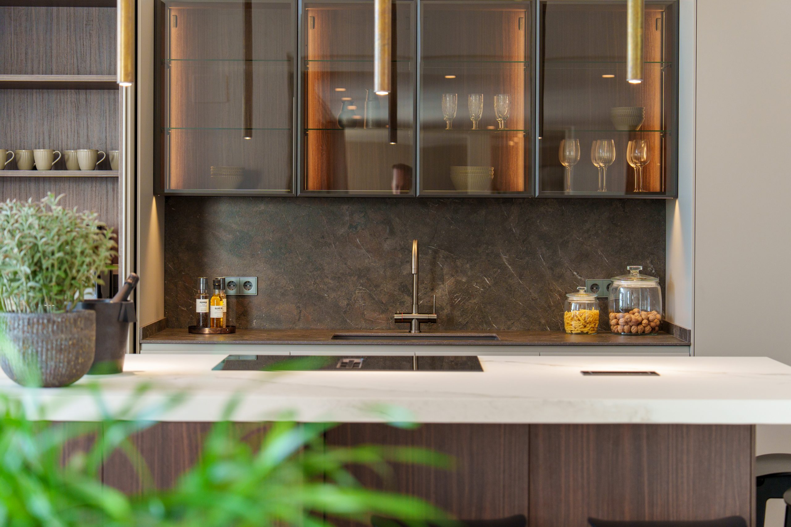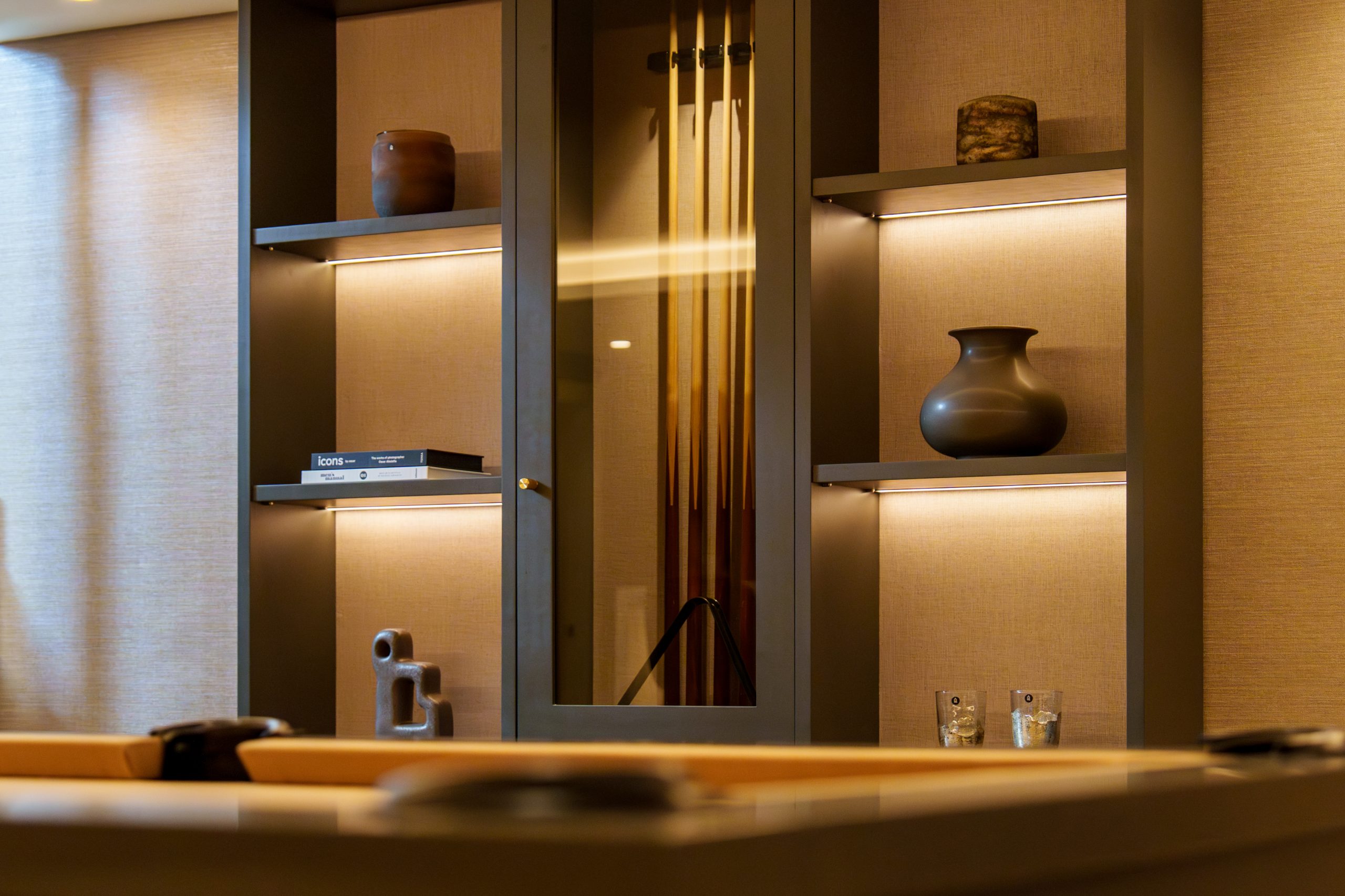 La planta principal ofrece un gran salón-comedor de concepto abierto que envuelve una cocina de diseño con isla central. La vivienda cuenta con cinco amplias suites, destacando una suite principal panorámica con terraza privada y vestidor. En la planta inferior se ha diseñado una zona de ocio sofisticada con sala de entretenimiento, bar, bodega acristalada y billar, además de aseos de cortesía y amplio almacenamiento.