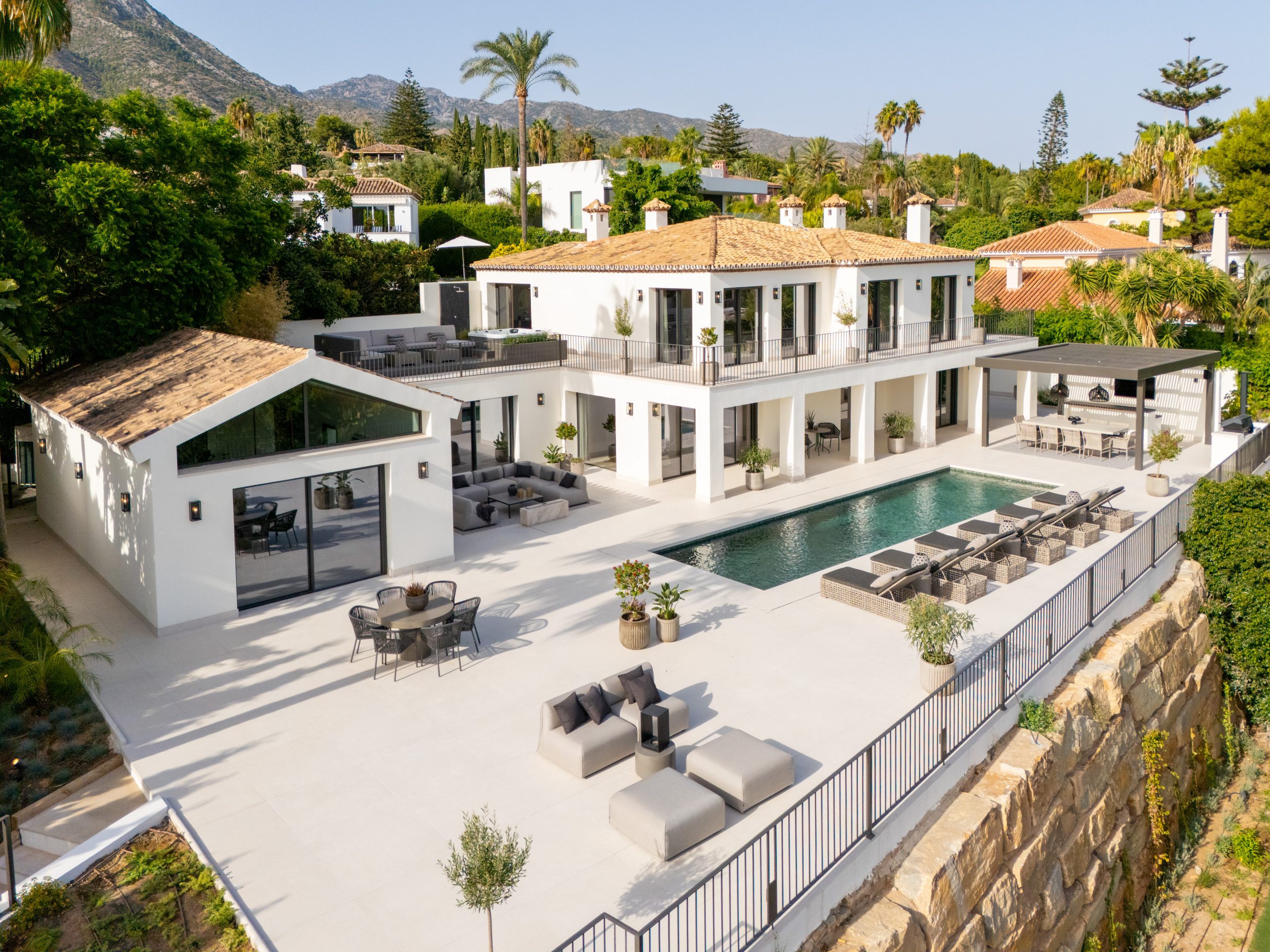 Villa Rocío es una residencia andaluza completamente renovada en 2025, ubicada en la exclusiva urbanización Rocío de Nagüeles, en la codiciada Golden Mile de Marbella. Orientada al sur sobre una parcela de 2.000 m² a los pies de La Concha, la villa combina arquitectura tradicional y acabados contemporáneos: 734 m² de interiores inundados de luz gracias a vidrios de altura completa y techos abovedados que abren los espacios hacia el exterior.